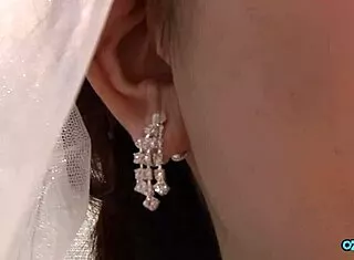 Asian bride in wedding gown fingers pussy while visitor watches