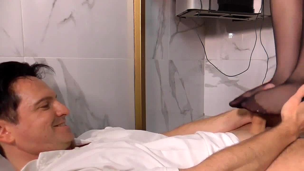 Does the secretary in nylon stockings give a handjob with high heels?